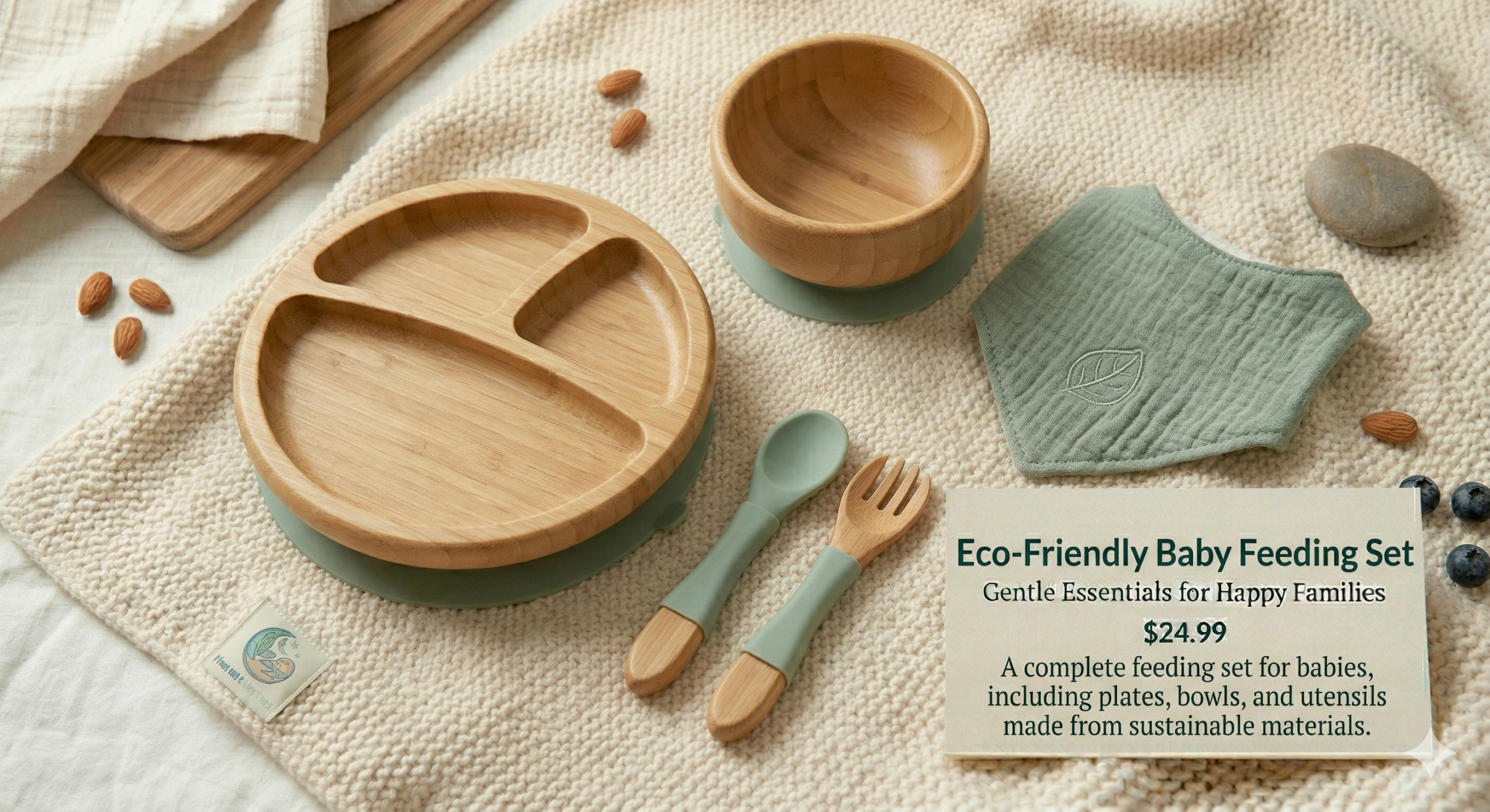 A complete feeding set for babies, including plates, bowls, and utensils made from sustainable materials.