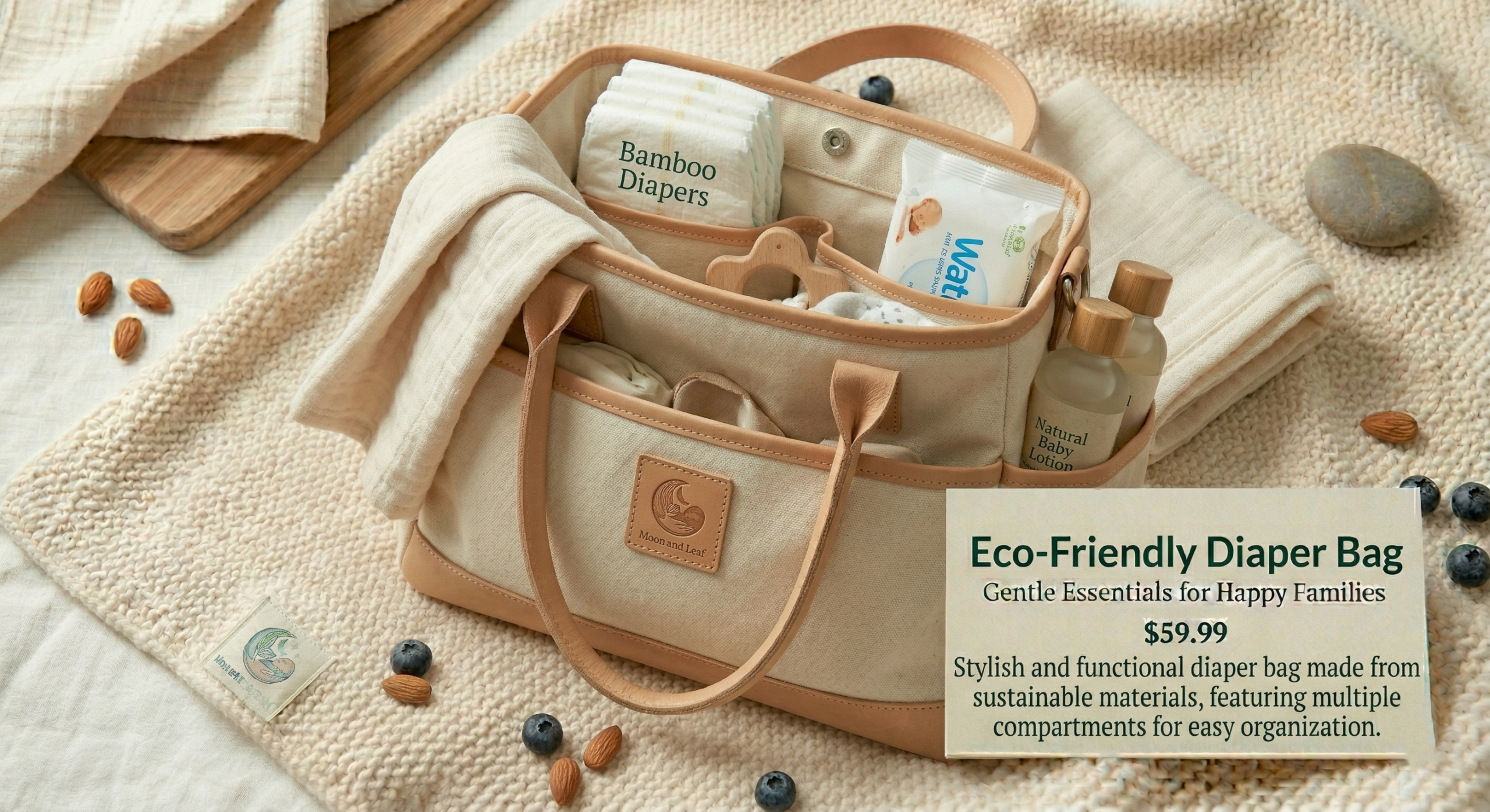 Stylish and functional diaper bag made from sustainable materials, featuring multiple compartments for easy organization.