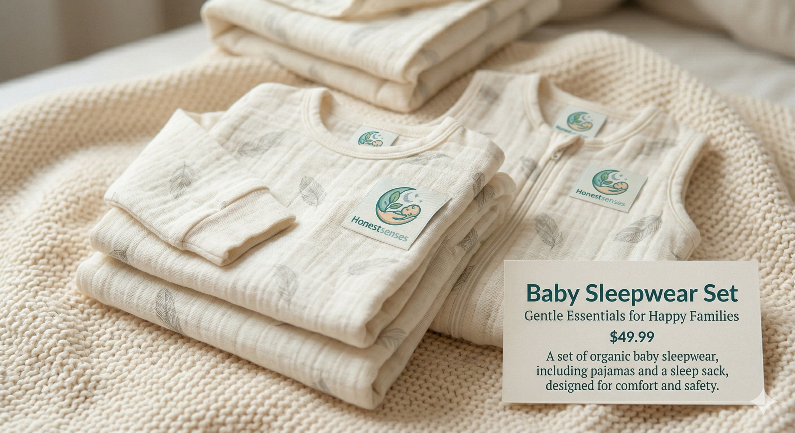 A set of organic baby sleepwear, including pajamas and a sleep sack, designed for comfort and safety.